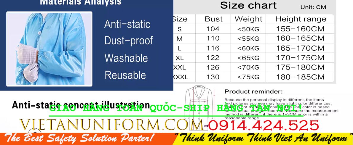 3/Bảng Size Đồng Phục Phòng Sạch Dùng Trong Phòng Sạch Chống Tĩnh Điện :
